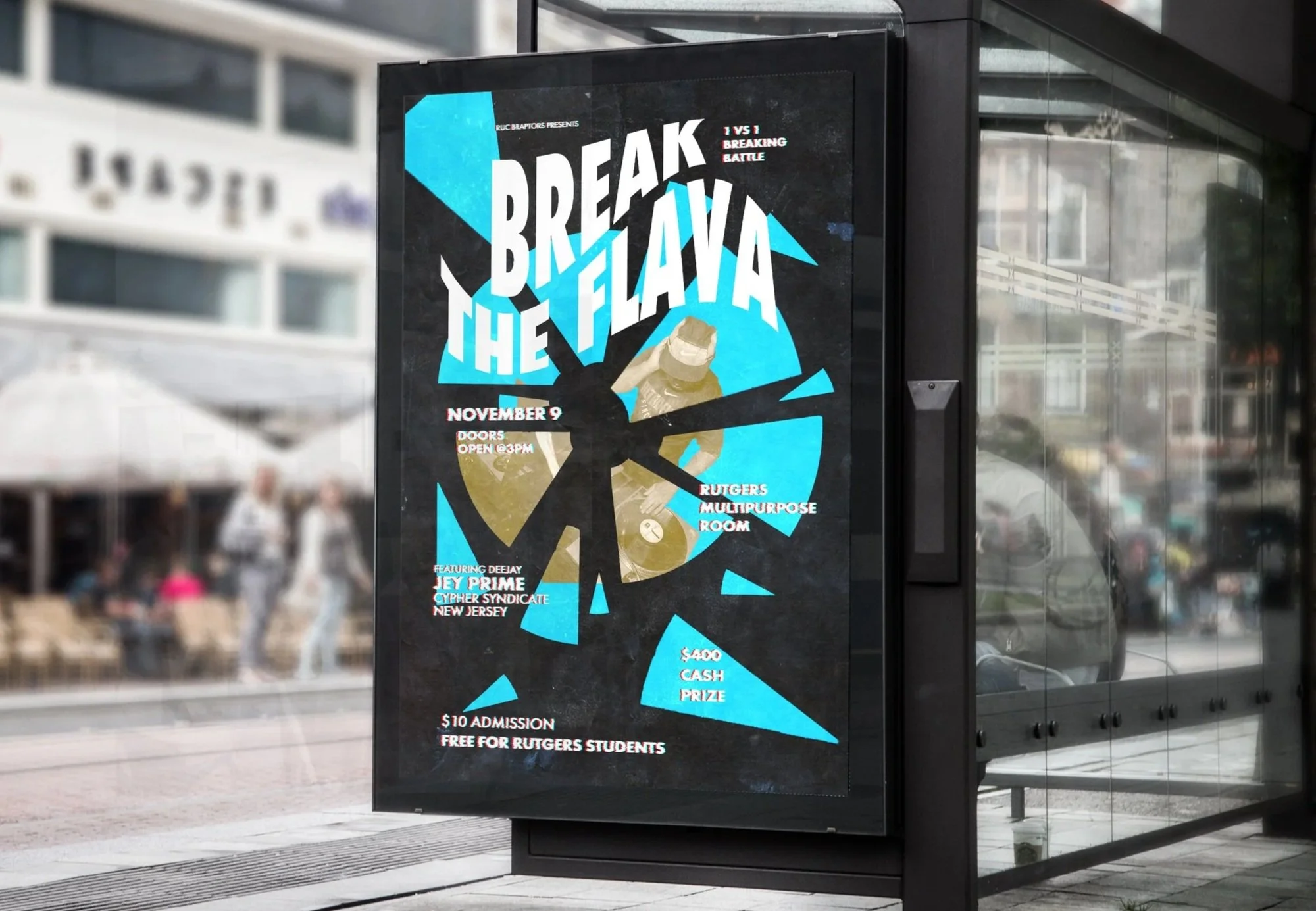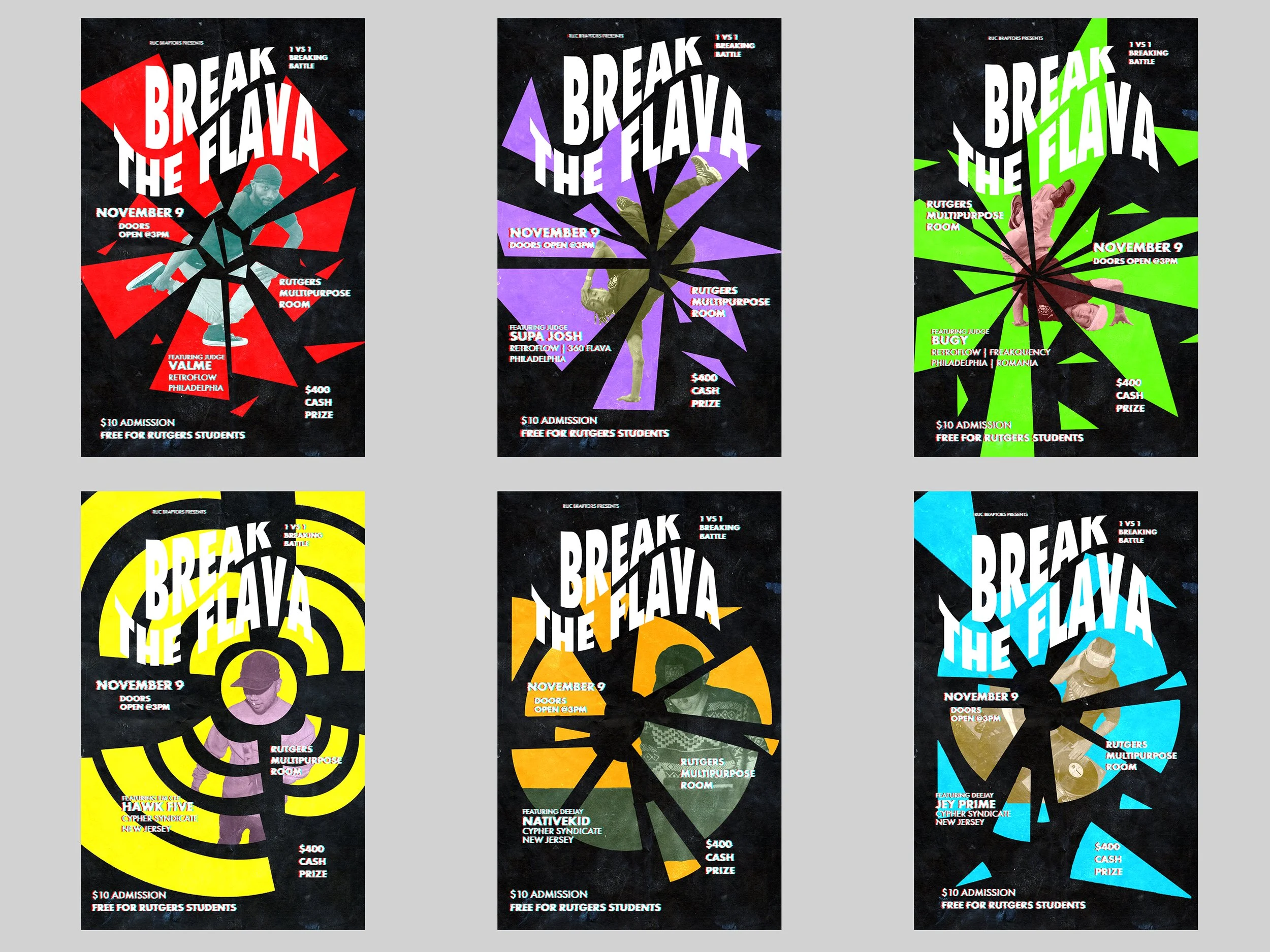 Along with advertising the event, I’ve created a visual for the competition. The video showcases all the information of the event while showing footage of the judges breaking. Each subject are close friends of mine from my breaking crew “Retro Flow” and “Cypher Syndicate”.